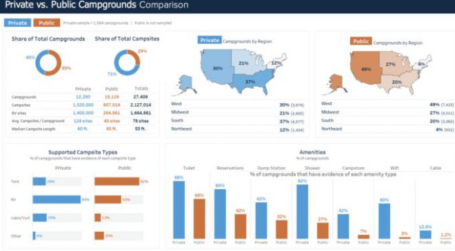 Public campgrounds—comprising federal, state, county and municipal facilities—meanwhile, outnumber their private counterparts, at 15,119. But because on average they’re significantly smaller, they have a total of only 607,014 campsites. More to the point, fewer than half of the public campsites—264,861—can accommodate RVs. Of those, only 30% have water hookups and a mere 8% have sewer connections. That latter statistic is especially telling at federal campgrounds, among which just 11.3% have dump stations.